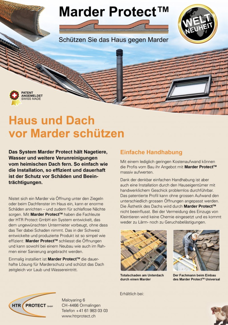 Ist Ihr Dachfenster undicht oder haben Sie ein Problem mit Mardern, die durch undichte Stellen am Dach in Ihr Haus gelangen? Hier bieten wir Ihnen als Fachbetrieb eine kompetente Lösung. Herkömmliche Dachkonstruktionen können die Gefahr bergen, dass durch undichte Stellen Marder eindringen oder Regenwasser sich einen Weg bahnt. In Zusammenarbeit mit der Firma HTR Protect GmbH montieren wir bei Ihnen einen zuverlässigen Schutz gegen Wassereintritt am Dachfenster und zur Vorbeugung von Mardern. Die von HTR Protect entwickelten und patentierten Produkte werden von uns fachgerecht montiert und sorgen dafür, dass die lästigen kleinen Tiere sich nicht unbemerkt auf Ihrem Dachboden einnisten können und schlimmere Schäden anrichten. Die Produkte schützen Sie ebenfalls vor ungewolltem Wassereintritt auf Ihrem Dach. Falls Sie Fragen zu den Produkten von HTR Protect oder zur Montage haben, zögern Sie nicht, uns anzusprechen.